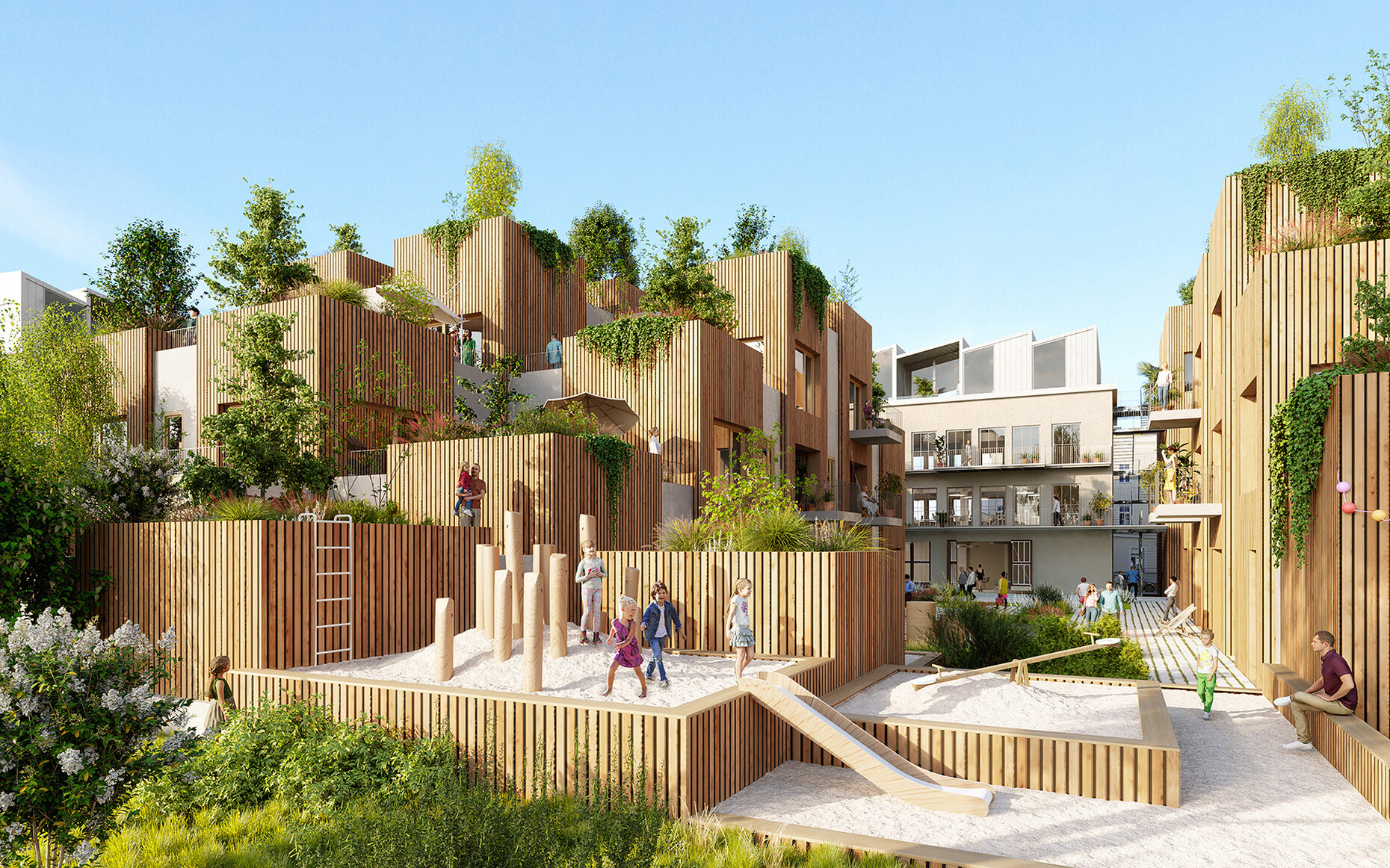 The exhibition on the future of construction invites visitors to engage in a lively debate focusing on fundamental design principles for a climate-friendly renewal of our building culture. This includes, in particular, topics such as climate resilience, biodiversity, sufficiency, revitalisation, cycle management, experimentation and taking action.