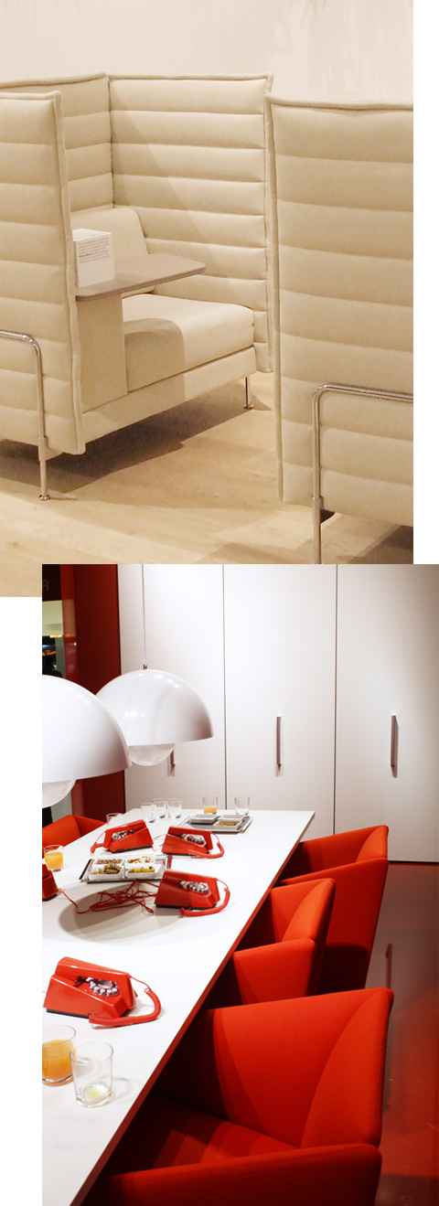 "Workstation Areas", as they are called, are nothing other than the transformation of the idea of the classical office under conditions of deterritorialization. Here you can work alone in "clusters" or in groups, standing or sitting, at firmly allocated or at "non-territorial" workstations. In all of this, few would have imagined the momentum of the ball the Brothers Bouroullec set rolling in 2006 when the launched the highback version of their "Alcove Sofa". It offers ‘nesting options' not just in a lounge, but also in the open territory of the office - in the latest version it boasts a writing tablet and a filing system beneath it, and without the nest no however open territory would function. Moreover, and this definitely applies not only to Vitra, there is a general need for so-called ‘Silent Rooms', ‘Debate Rooms' or ‘Media Rooms'.