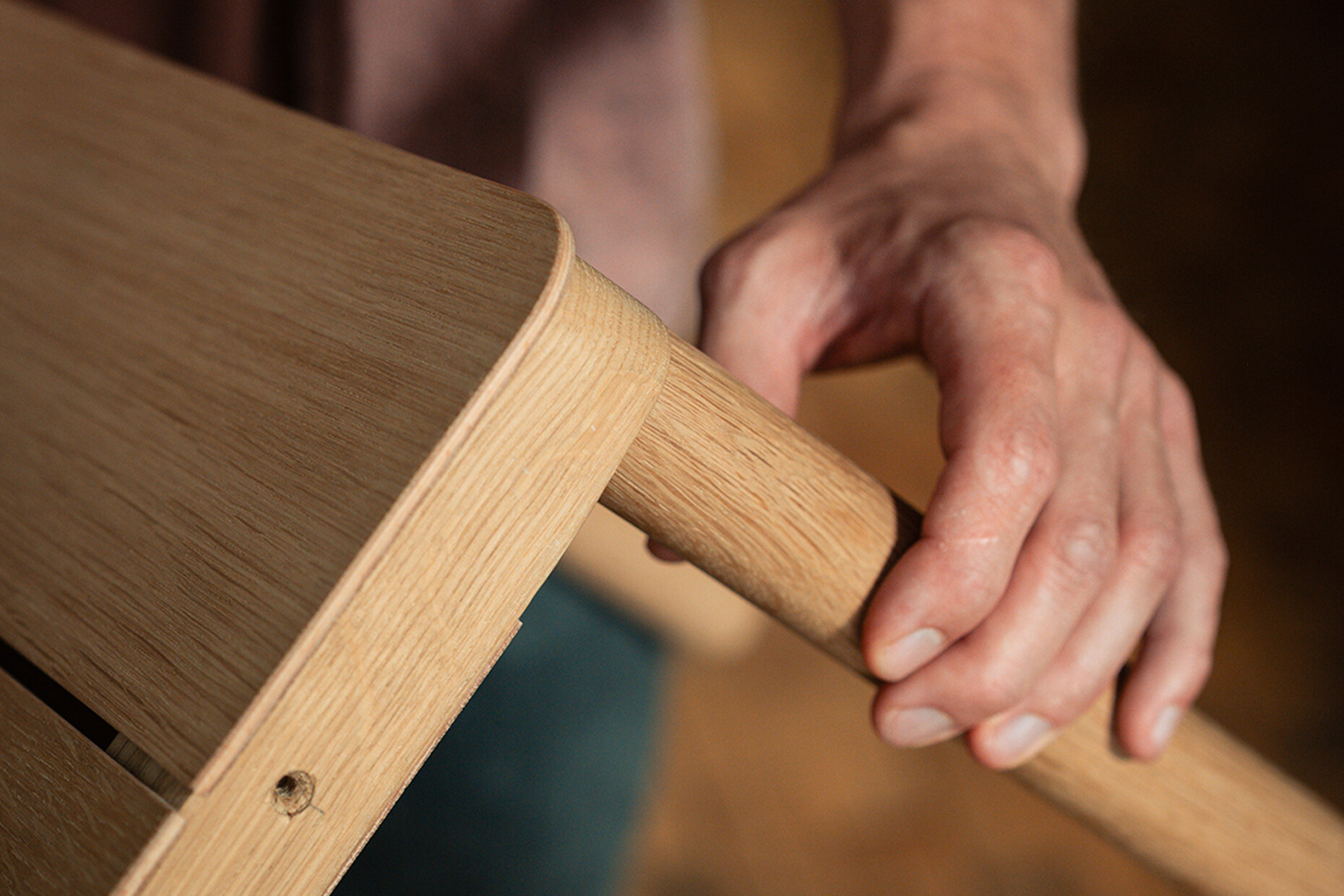 For him, it's about more than ‘just’ making things. Developing good ideas, finding innovative solutions and implementing them in a way that is appropriate to the material and craftsmanship – all this fascinates Marcus Götschl. In the ‘Norr’ lounge chair, in which he processes his impressions of Norway, conventional and traditional craftsmanship are still clearly evident. Subsequently, however, he begins to break away from this and sometimes deliberately breaks with convention. The ‘Tension’ stool combines gentle curves and precise joints with reduced material thicknesses in the seat, which becomes flexible and gains its stability through pressure and tensile stress. In both designs, the joy of the material and the desire to create something new are palpable, contributing to their creation.