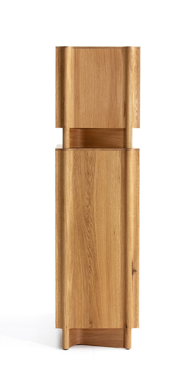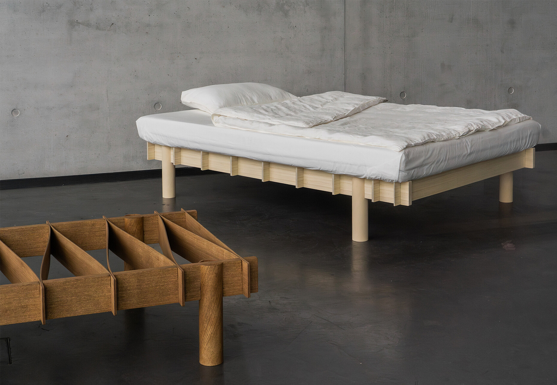 The ‘NaKu’ shelf, developed in collaboration with the furniture brand Zeitraum, is more complex. It consists of two modules that can be stacked or arranged in various ways – as individual objects or as an entire shelving unit. Marcus Götschl's aim here was to reduce the consumption of solid wood to a minimum: very thin solid wood surfaces are stabilised by ‘leaf veins’. ‘It's like holding two spaghetti strands against a sheet of A4 paper,’ explains Götschl. The ‘NEW GEN’ bed, whose individual parts are joined with simple plug connections, also follows this logic: the connection stiffens the system in all three dimensions, creating a stable base for the mattress that is both a functional slatted frame and an aesthetic framework. The designer says: ‘Rethinking everyday objects and questioning whether designs that are decades or even centuries old are still state of the art – is a slatted frame really still necessary today with all the high-performance foams available?’ Here, too, he works with minimal material thicknesses, which are inserted into the construction in a curved state.