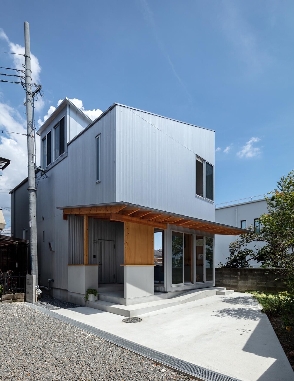 Kohei Yukawa built a house for himself and his family and immediately after moving in discovered what highly practical solutions traditional Japanese architecture provides for very current challenges. He planned and realized the structure that is largely clad with corrugated metal on 126 square meters in Ibaraki City, Japan with a doma: an entry room that although inside also has the characteristics of outdoor space and that is not assigned any specific use. For one thing in traditional Japanese houses the doma was the place where you cooked on an open fire, but the space protected from wind and the elements was used above all for those jobs that simply involve dirt – that could be easily removed again from the hard compacted earth. The doma was always separated from the living space by a step which marks the spot where you remove your shoes before entering the apartment proper.