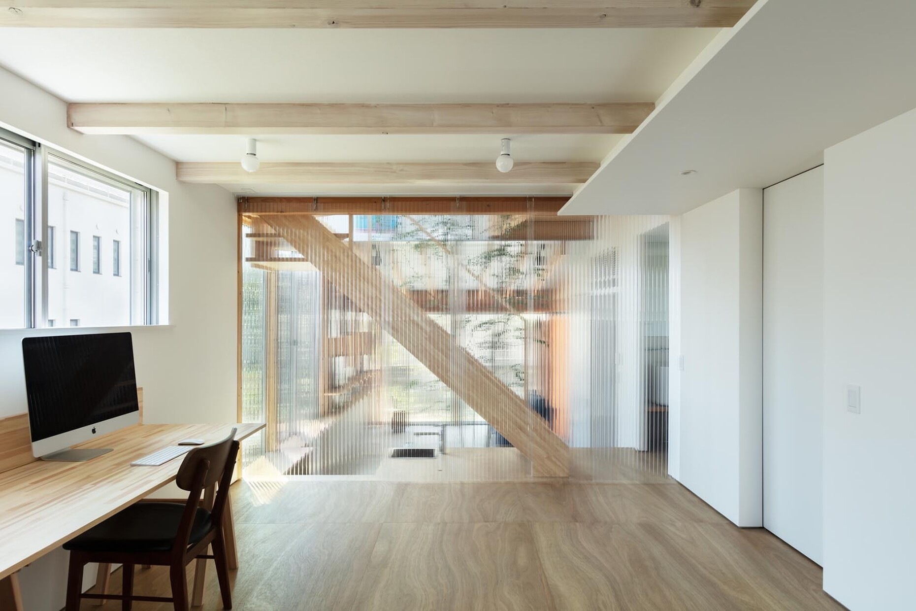 The architect conceived the ground floor of the house as such a doma although thanks to the mortar floor you can remove your shoes before entering the house? Yukawa’s approach involved designing the house with a room that had no specific function: As such, it can serve as a place for the kids to play or as a temporary workshop, can be used for small exhibitions or for an event. What the architect could not have imagined while he was planning it: Just four months after they moved in the corona pandemic suddenly restricted his family’s movements severely– from March 2020 people had to spend a lot of time indoors. Given the restrictions on leaving the house and meeting other people the ground floor morphed into an open space for a new kind of everyday life: Thanks to generous glazing there is a visual connection linking the outdoors. Floor-to-ceiling windows allow a visual link to the courtyard that was sealed with the same mortar floor as the indoor area. Inside it is possible to section off a study thanks to sliding partitions of transparent polycarbonate.