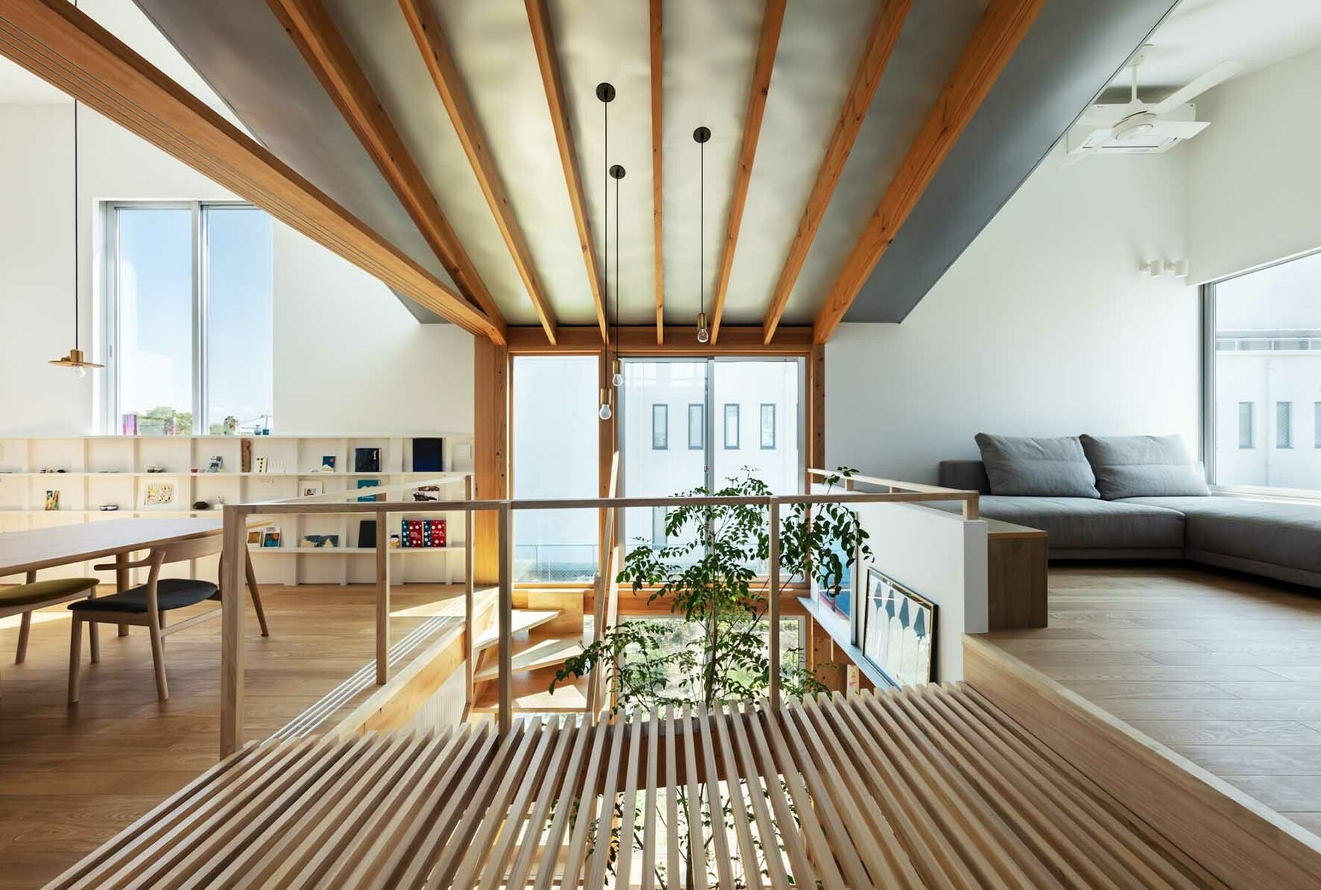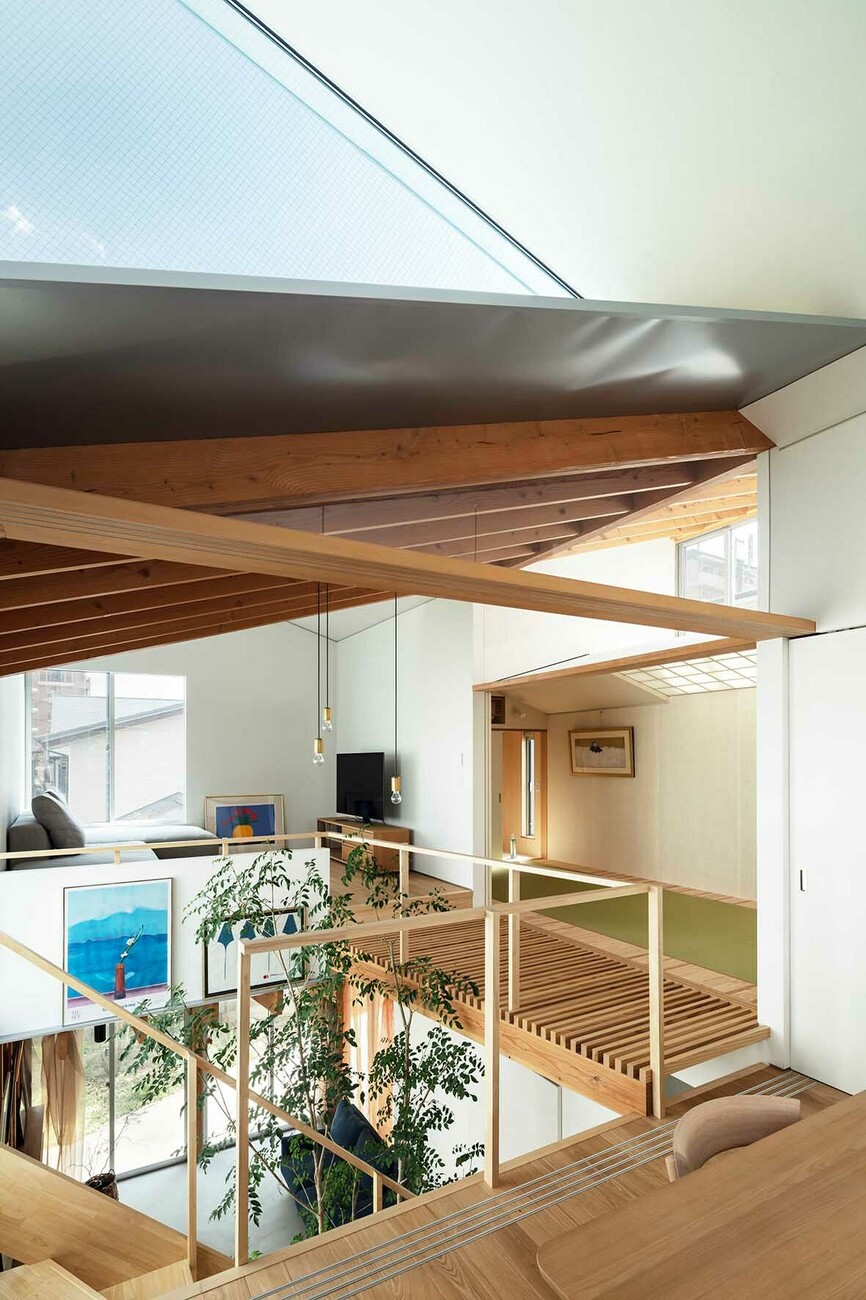 Something else that proved ideal for the new situation was the decision to plant a Formosana ash tree in the doma itself. It stays partly green for the entire year and its leaves extend into the fop floor. Thanks to a large skylight ample daylight enters the kitchen installed there as well as the television room and bedroom. To the side and somewhat separate is the washitsu – a traditional room for receiving guests fitted out with tatami floor mats and sliding screens of wood and rice paper, shōji. In this manner Kohei Yukawa has integrated elements of traditional Japanese architecture into the entire house but also adapted them to the lifestyle of a young family. Moreover, custom-made cladding, stairs and fitted elements of wood provide practical storage space and a pleasant, cozy feeling. In addition, the differing ceiling heights and the impressive diversity of materials and structures contribute to the living space seeming much larger than it actually is in terms of square meters.