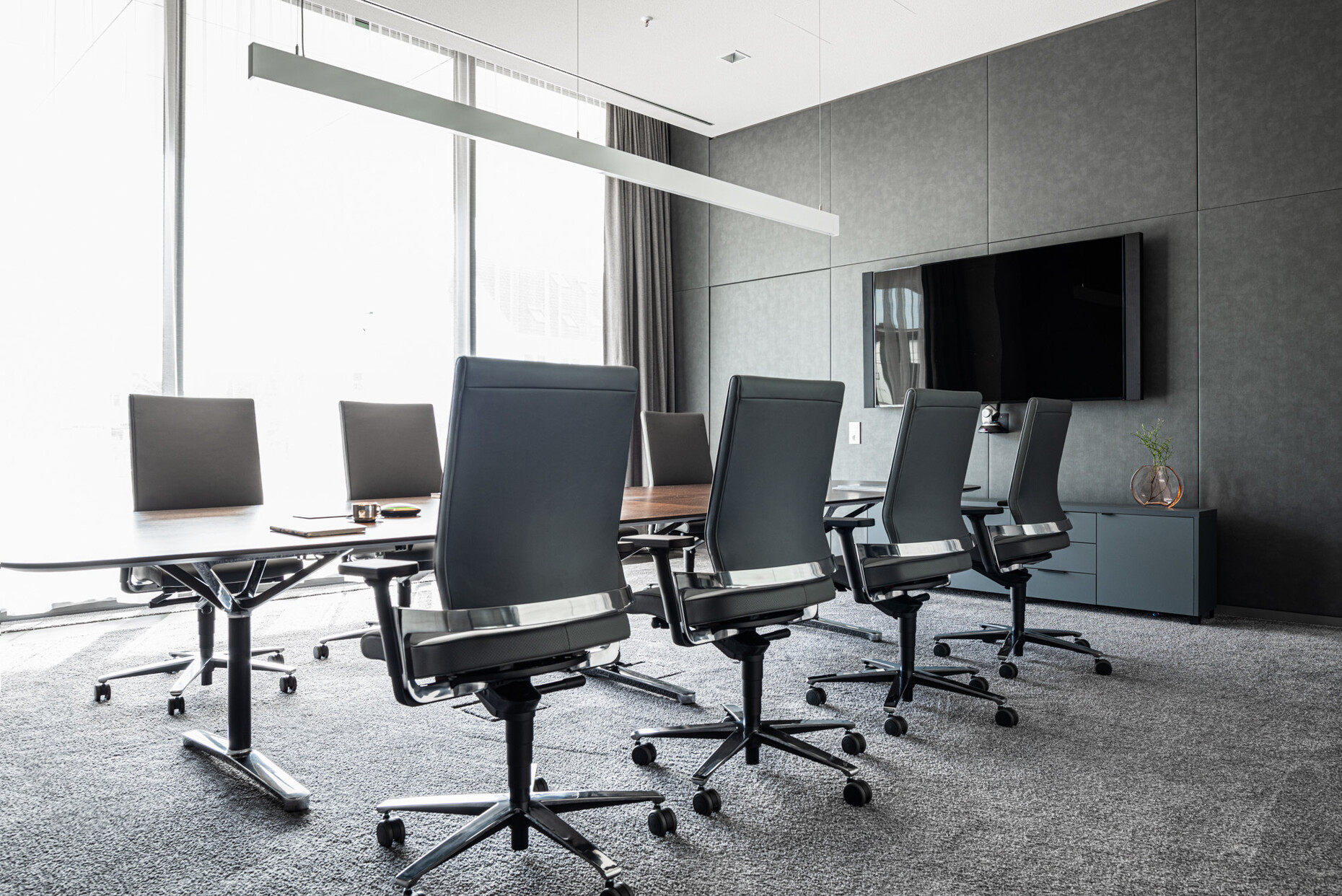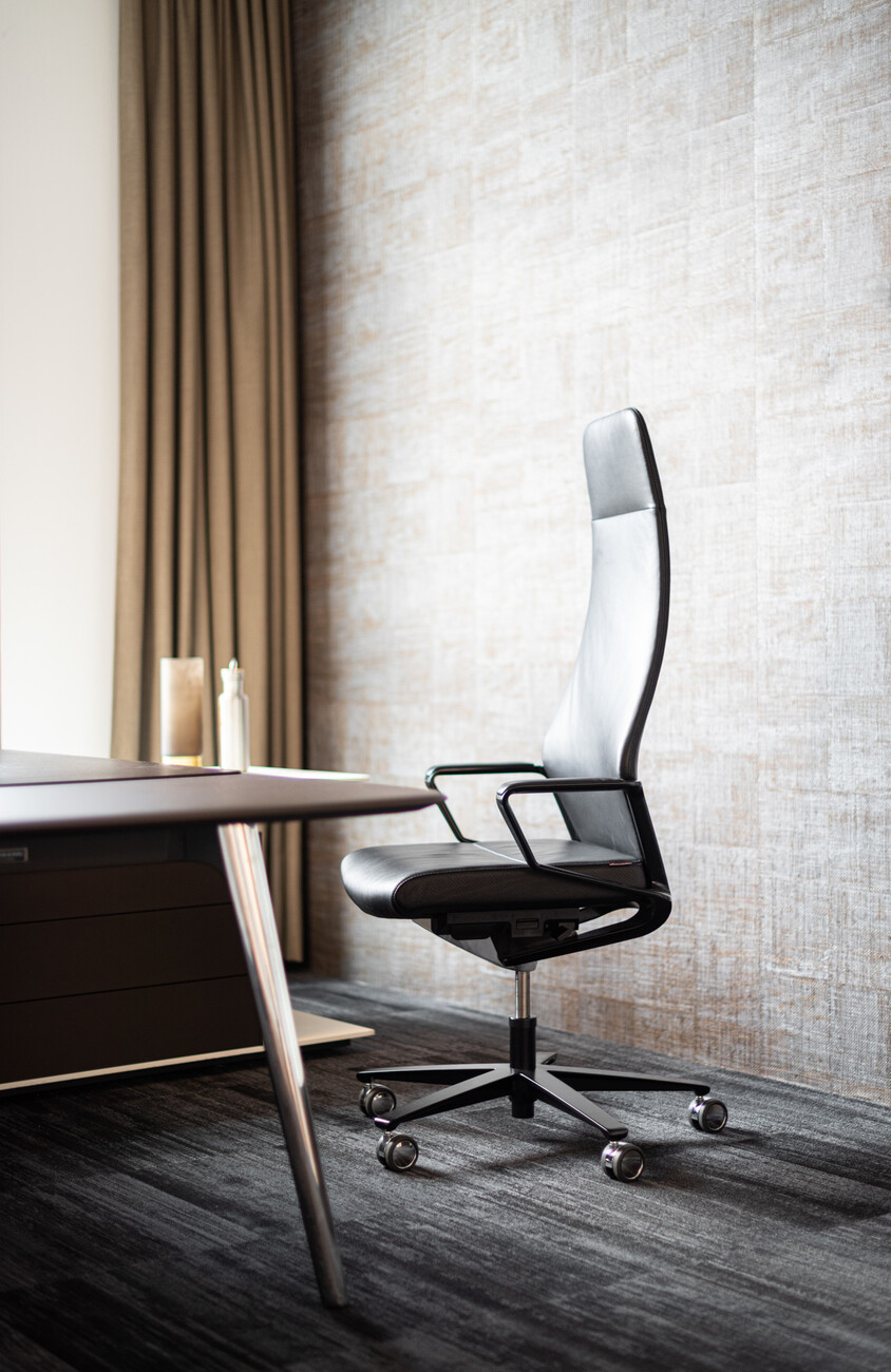 The “Signo” swivel chair, for example, exudes class, not least thanks to the interplay of the precisely molded aluminum back frame and the backrest itself, which is dynamically curved yet delicate. The elegant stitching likewise testifies to the precision work that goes into “Signo”. Thanks to the extra-large seat, which is constructed from multilayered molded foam, the chair provides for a relaxed and comfortable feeling for the sitter. The aluminum curved rear frame of the “Signo” appears particularly harmonious in combination with the integrated armrests, which are produced from the same material. An alternative option is multifunctional armrests that can be adjusted in their height, breadth and depth, and there is a choice of cover materials encompassing soft polyurethane and leather. In the version created as a conference chair, “Signo” is available with backrests in two different heights, and there are three heights available for the swivel-chair version. High-quality leather and fabric are the options for the cover material, but either variation makes a statement in any meeting room and in any management office.