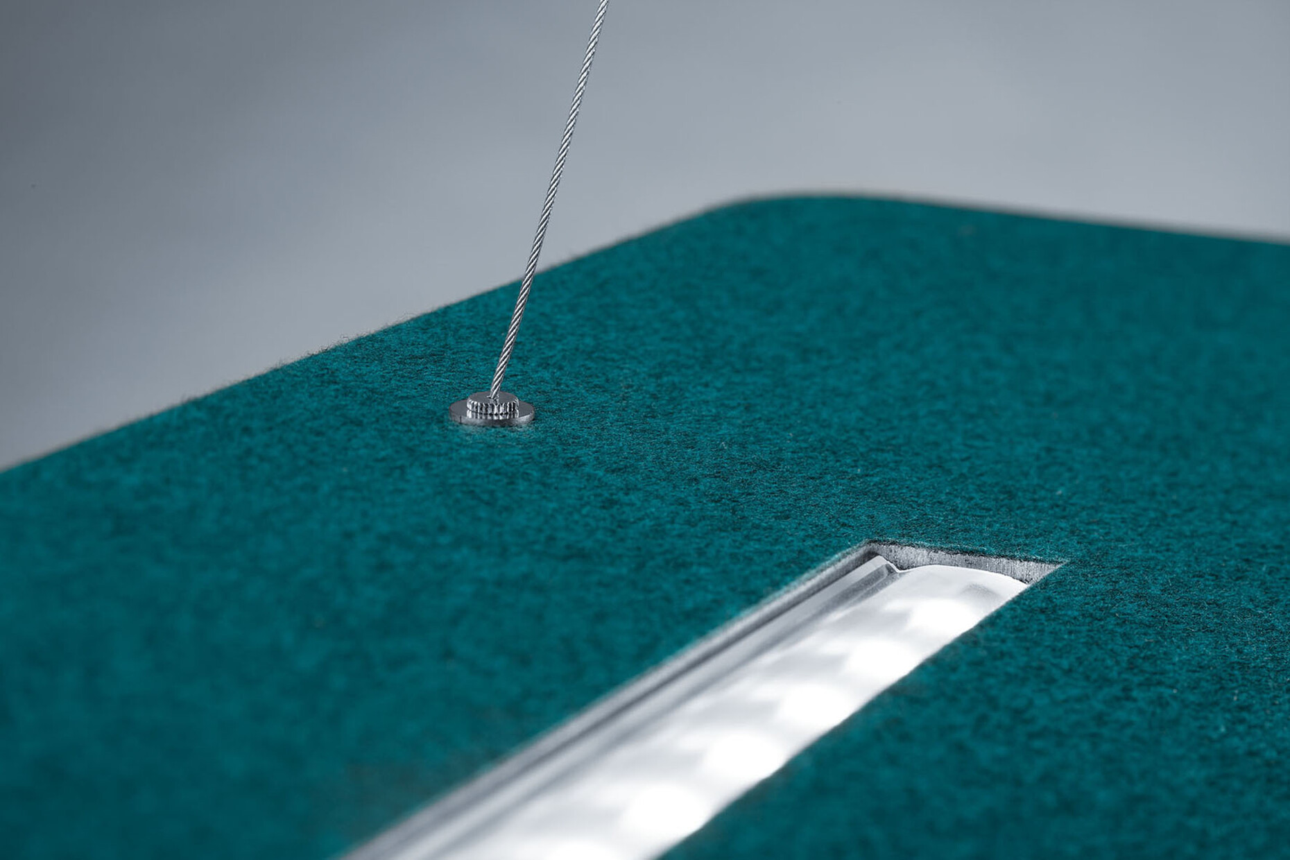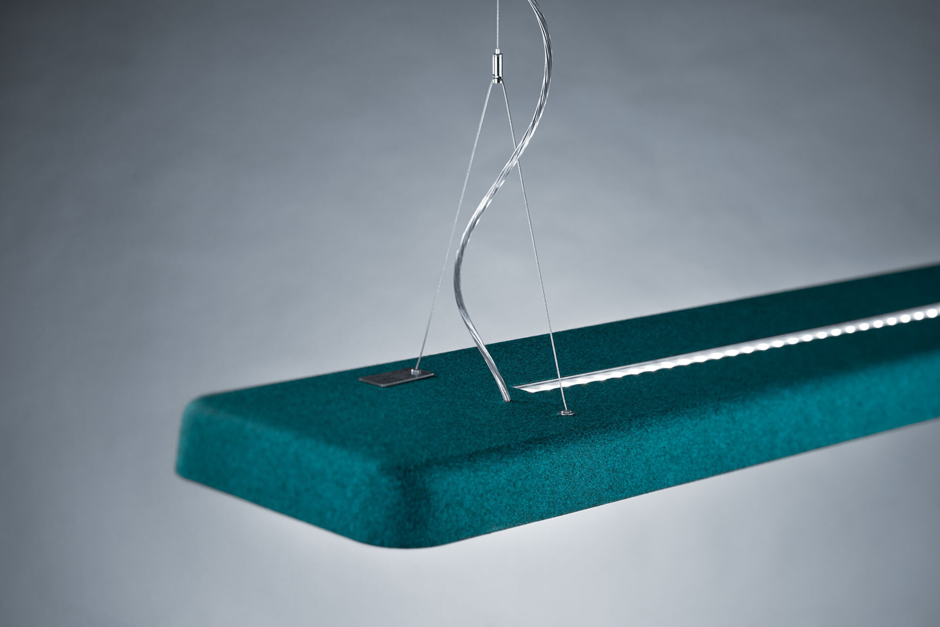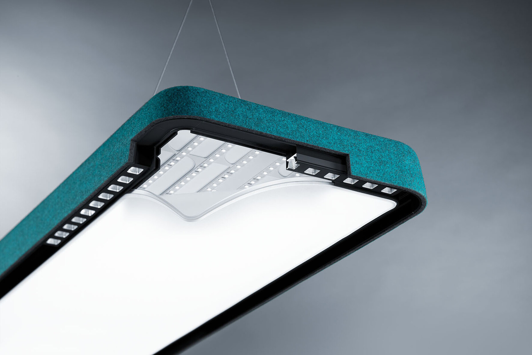 "The market expects holistic solutions for increasingly complex projects. Interior design requirements have altered and off-the shelf designs are losing their appeal. It is precisely these more sophisticated demands that we would like to meet. This was an example of us thinking outside the box in order to offer a broader range of ideas," explains Armando Hödl, Global Product Manager at Zumtobel. "TRAMAO" is the name of the new pendant luminaire; created through the joint efforts of Zumtobel and textile expert Typico it combines excellent light quality with good sound absorption and modern design. There is a choice of two sizes, 19 different colors, two looks and various color temperatures and light directions, not to mention regulation via DALI and Bluetooth. The non-woven cover with its felt-like look not only produces a fascinating material quality in the room but also helps dampen sound. As the mottled fabric of "TRAMAO" can vary subtly this means that every pendant luminaire is essentially unique. To produce the rectangular structure with rounded edges thermoplastics are added to the pliable non-woven fabric to lend it the necessary thickness and rigidity. "One challenge is to gauge the right amount of thermoplastic in order to generate a material that is both an effective sound-absorber and sufficiently sturdy. The aluminum holder for the LED components is perforated so that the non-woven can absorb soundwaves from below and equally what is reflected from the ceiling," explains Hödl. And adds: "Every LED component in this luminaire has a multipolar function making 'TRAMAO' an exemplary, cost-efficient, sustainable and functional product“. The body of the luminaire is available either with an opal appearance or a coffered design – the latter took its cue from the coffered ceilings, say of the pantheon in Rome. However, not only do the two options have a different appearance their function also varies: "The coffered design of the Acoustic Light Shaper diffuser has a demonstrably better acoustic efficiency in the higher frequencies," says Armando Hödl.